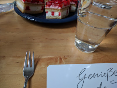 Dann ist es Zeit für Kuchen. Findet das Runzelfüßchen und deckt unsere Kaffeetafel mit wirklich allem. Weil sie nicht an die Teller herankommt essen wir von kleinen Brettchen, aber ich finde es trotzdem toll wie selbstständig sie das mit ihren vier Jahren gemacht hat. Nicht mal das Wasser fehlt.