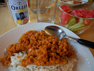 Abendessen. Es gibt natürlich die Gurke und Tomate. Dazu eins meiner liebsten Essen, auch wenn es gar nicht so toll aussieht. Linsendhal. Zu viert teilen wir uns noch eine winzige Urlaubs-Wasserflasche. Aus Koriska haben wir Orezza-Wasser mitgebracht, das es hier glaube ich gar nicht gibt. Aber so schwelgen wir gemeinsam in Erinnerung ans Meer und Sonne und unseren Urlaub.