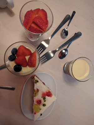 Am Nachmittag machen wir einen Ausflug zu Ikea. Ich bin da jetzt nicht so wahnsinnig gern aber ich hatte eine Geistesblitz für unsere Schlafsituation. Ich wollte ein 90cm Bett kaufen um es neben unser Bett zu schieben um so ein kurzzeitig vergrößertes Familienbett zu haben. Es gibt aber keins was mit der Höhe unseres Bettes kompatibel ist, weswegen wir nun nach einer neuen Lösung Ausschau halten. Aber wenigstens gibt es Kuchen. Und Erdbeeren.