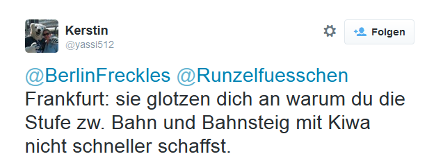 - Die Leute sprechen mich aggressiv an „Du kannst mal schön bitte bitte sagen, sonst passiert hier gar nichts, blöde Schlampe“. Öhm ja. Ich bin diesem Menschen aus verschiedenen Gründen über den Fuss gefahren. Mehrfach. Die Waffen einer Mutter und so.