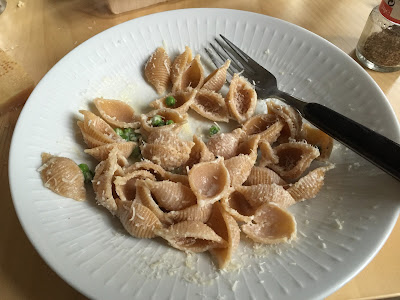 Abends gab es ein schnelles Essen. Bei Nudeln in Erbsen-Sahne-Sauce kommt gute Laune auf und niemand (also nicht ich) muss lange kochen.