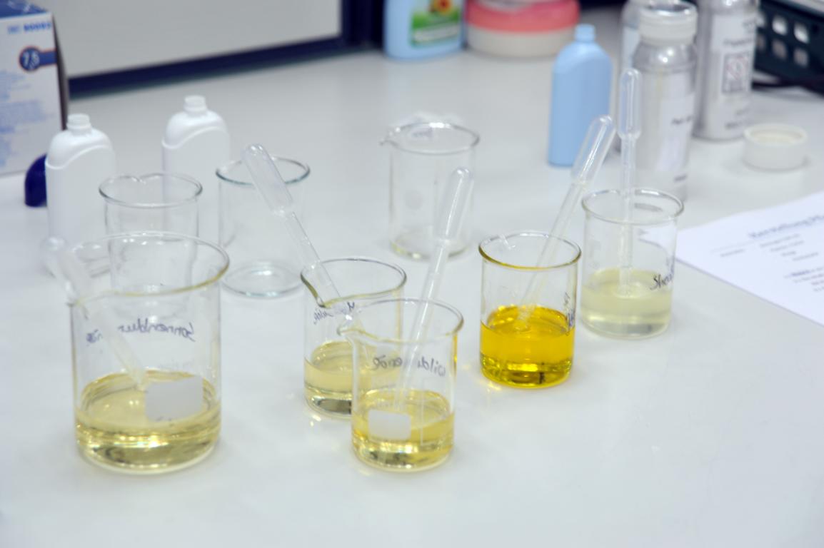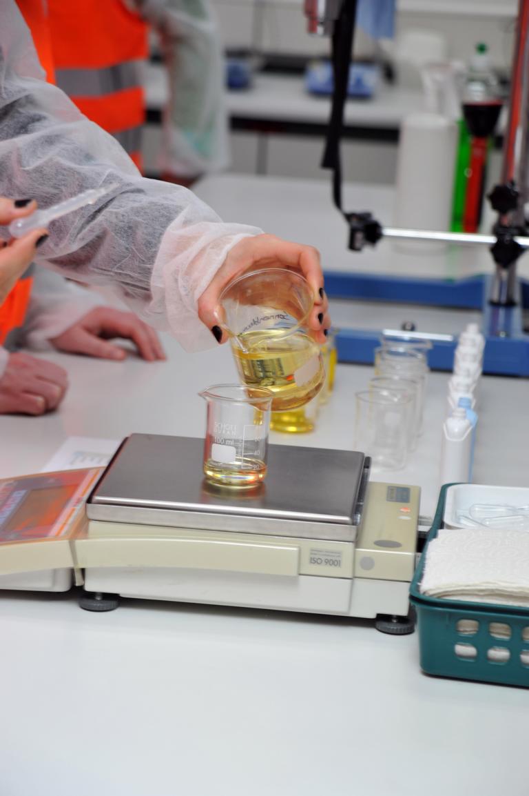 Das fand ich persönlich total spannend. Es ist nämlich so, dass die Chemiker neue, ich sage mal „Mischungen“ zuerst an sich ausprobieren. Und wenn sich nach 48 Stunden keine Hautreaktionen zeigen, dann wird das im etwas größeren Stil produziert. Anschließend werden die Produkte dann an Neurodermitis-Erkrankten getestet. Denn es muss sichergestellt werden, dass Menschen mit sehr sensibler Haut nicht darauf reagieren, bevor es überhaupt in Betracht gezogen wird, dass Kinder damit in Berührung kommen dürfen. Wenn diese Testergebnisse auch positiv sind, dann geht alles in Produktion. Also das war mal der chemische Teil, der mich daran am meisten interessiert hat.