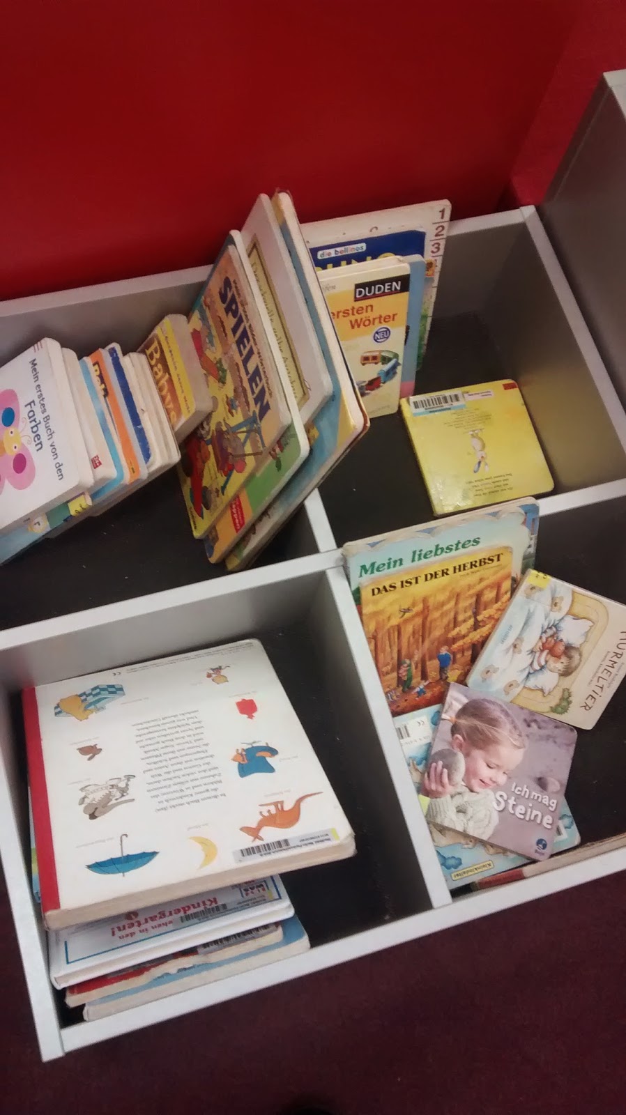 In Verbindung mit der Bibliothek sind Kinderbücher für mich ein wahrer Lebensretter. Denn das Runzelfüßchen liebt es vorgelesen zu bekommen. Da wird sie ruhig und kommt aufs Sofa. Sowohl während der Schwangerschaft als auch jetzt mit Herrn Annika kann ich das Kind also bespaßen und gleichzeitig etwas zur Ruhe kommen. Dafür braucht sie aber ständig neues „Futter“. Und da kommt dann die Bibliothek ins Spiel.