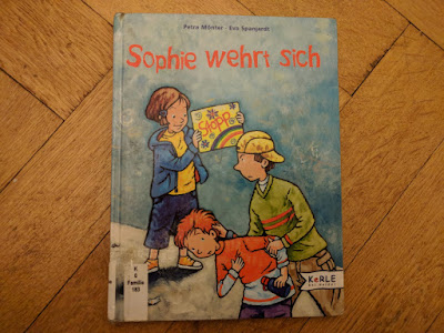 Ein Buch aus der Bibliothek. Sophie wird auf ihrem Schulweg von Älteren bedroht, ihr werden Sachen weggenommen, dann werden ihre Freunde geschlagen. Sophie erkennt, dass sie Hilfe von Erwachsenen braucht. Das finde ich aus dem Grund eine wichtige Aussage weil es eben wirklich Sachen gibt, die Kinder nicht mit „Stop!“ und „Nein!“ allein regeln können.