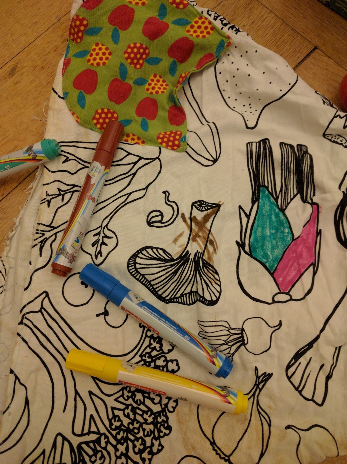 Etwas, das hier auch hoch im Kurs ist: Kleidung anmalen. Nur, äh, eigentlich so gar nicht ok. Die Striche und Kleckse die ich schon auf den Klamotten vom Runzelfüßchen gefunden habe mache ich manchmal ganz schön traurig. Deswegen habe ich mir Stoff besorgt, der zum Ausmalen quasi prädestiniert ist. Bei Ikea gibt es immermal wieder weißen Stoff mit Haushaltsdruck. Für sehr wenig Geld. Und aus diesem Stoff habe ich dem Runzelfüßchen einen Rock genäht. Den sie dann ausmalen durfte.