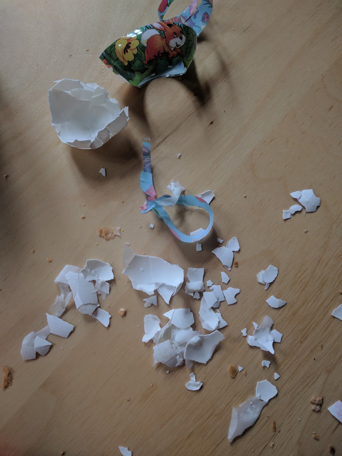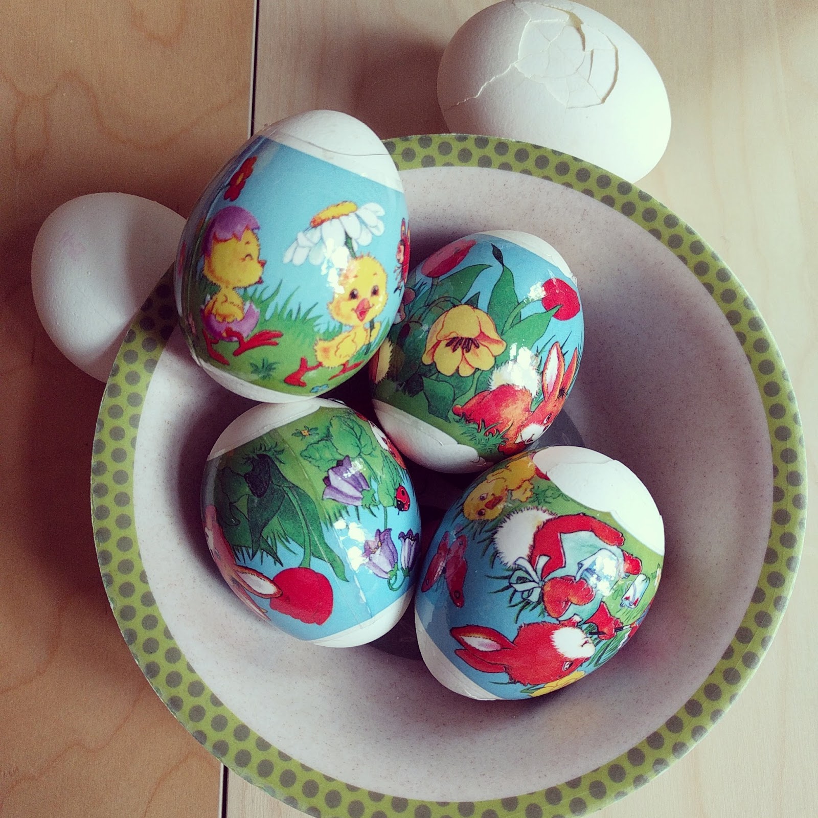 Irgendwann holen wir das Waffeleisen ab und fahren nach Hause. Das Runzelfüßchen will Eier färben, weil es aber schon so spät ist, entscheide ich mich für die schnelle Version mit Banderolen. Und es endet in einem Fiasko. Ich bitte das Runzelfüßchen nur, die hartgekochten Eier trockenzureiben, aber sie lässt jedes einzelne fallen. Am Ende bekommen nur viel angeplatzte Eier eine Banderole, wir haben beide schlechte Laune und ich denke darüber nach, was für unsinnige Entscheidungen ich manchmal treffe. Dazu schreibe ich aber am Mittwoch noch mal, versprochen.