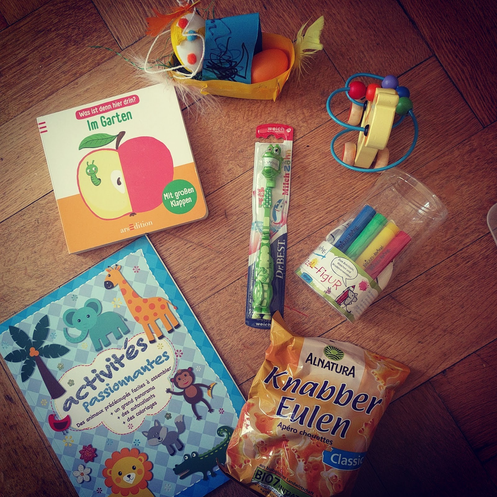 Der Osterhase kommt und bringt einige Überraschungen. Fürs Baby gibt es ein Roll-Schlengel-Spielzeug und ein Buch, fürs Runzelfüßchen ein Bastelbuch, ein Kuscheltier zum Anmalen und eine Zahnbürste. Obwohl sie bei der Zahnbürste anmerkt, dass wir die letzte Woche doch gekauft haben, die also nicht vom Osterhasen sein kann. Für beide Kinder gibt es noch Knabbereulen. Ihr seht richtig, keine Schokolade.