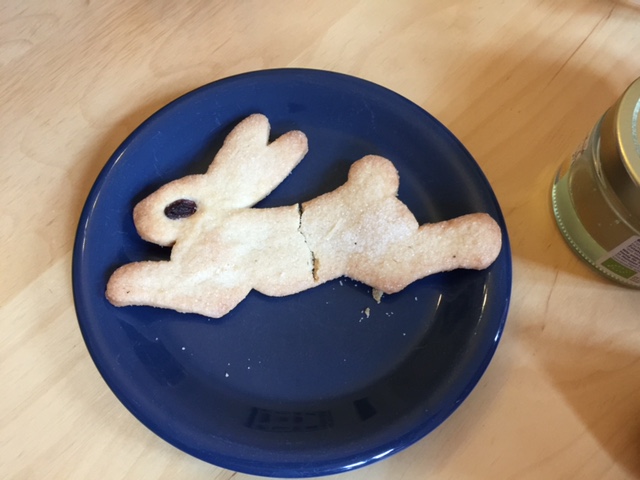 Der Morgen beginnt, wie so oft, ohne mich. Während ich schlafe knuspert das Runzelfüßchen am Hasenkeks. Sie lässt mir aber den „Po“ übrig, was ich sehr großzügig finde.
