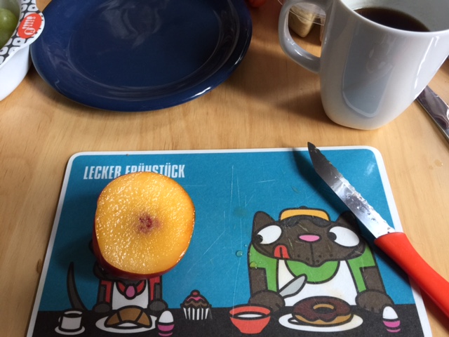 Der Samstag begann mit einem Frühstück zu dritt, denn Andrea durfte ausschlafen. Herr Annika hatte ordentlich Hunger auf Nektarine. Er riß mir die Nektarine förmlich aus den Händen, dass ich nur noch ein Foto von der anderen Häfte machen konnte. Ich mag, dass unsere Kinder so gerne Obst essen.
