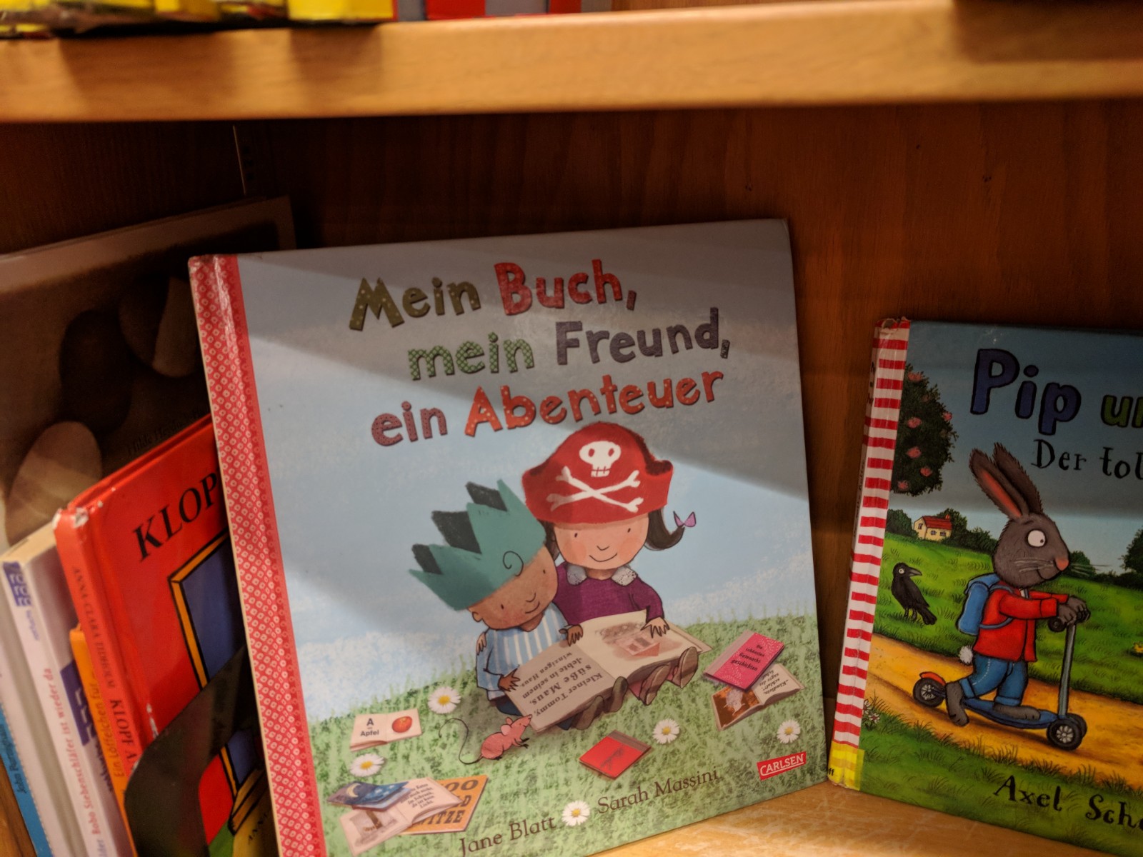Die Bibliothek ruft. Mein Mann ist auf der Blogfamilia und die Kinder sind sehr früh wach, wir müssen also warten bis die Bibliothek überhaupt auf macht. Nicht eben die Stärke von kleinen Kindern. Wir laufen also besonders langsam und schaffen es, pünktlich zum Aufschluss vor Ort zu sein. Der Vorteil: Es sind noch jede Menge Ecken frei in die die Kinder sich zurückziehen können. Und dann heißt es: Bücher stöbern. Ständig schleppen sie Neues heran und ich sehe meine Arme länger und länger werden. Wir einigen uns auf fünf Bücher pro Kind, wobei Herr Annika das nicht voll ausschöpft. Er hat sich nämlich unsterblich in das „Flugzeug“- Buch von „Frag doch mal die Maus“ verliebt. Ich muss lachen, weil das Runzelfüßchen das in einem ähnlichen Alter auch immer lesen wollte.