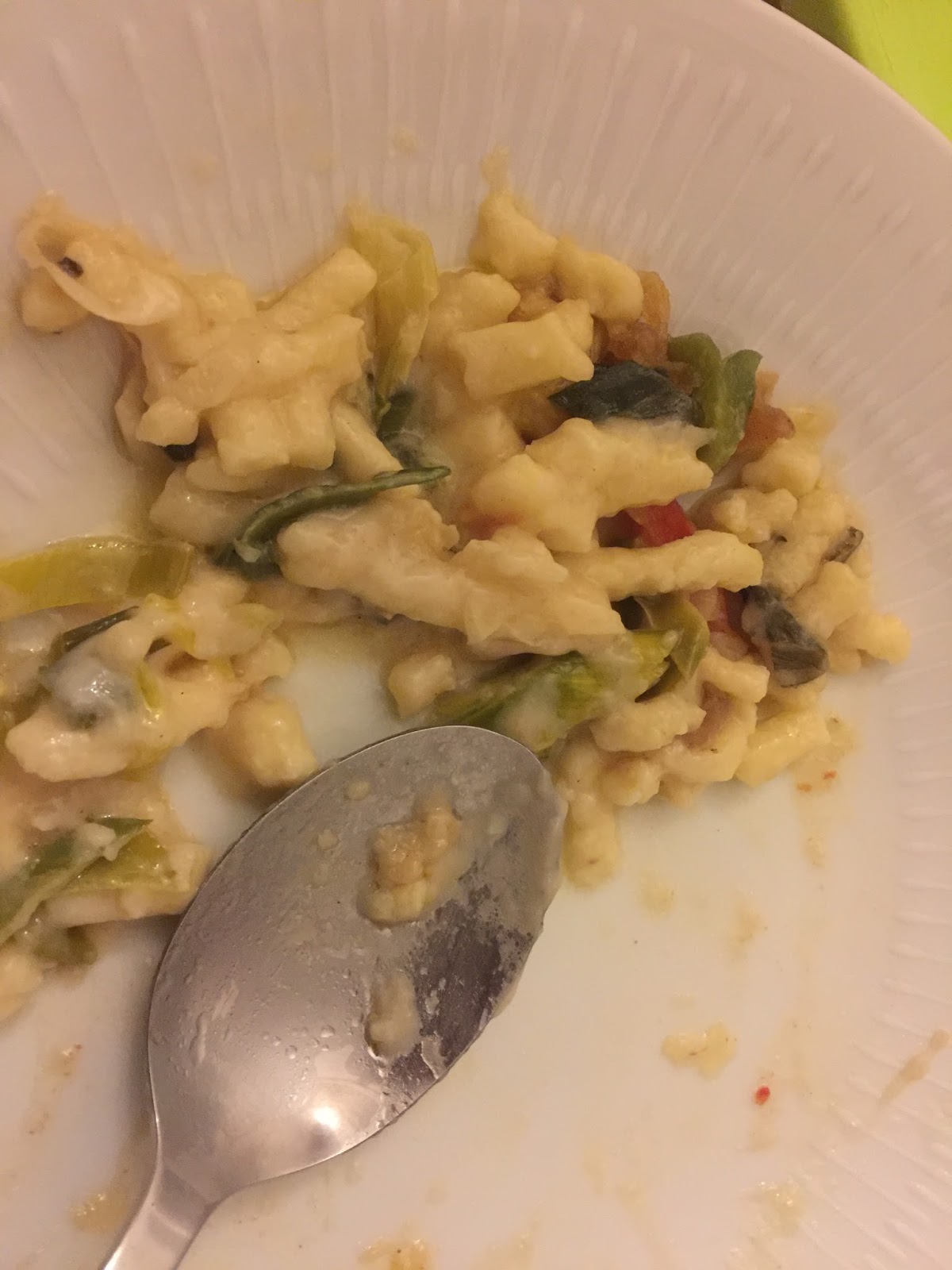 Fürs Runzelfüßchen gab es ein schnelles Abendessen, Käsespätzle mit Lauch und Paprika. Sie war verdammt müde und ist übers Essen fast eingeschlafen.