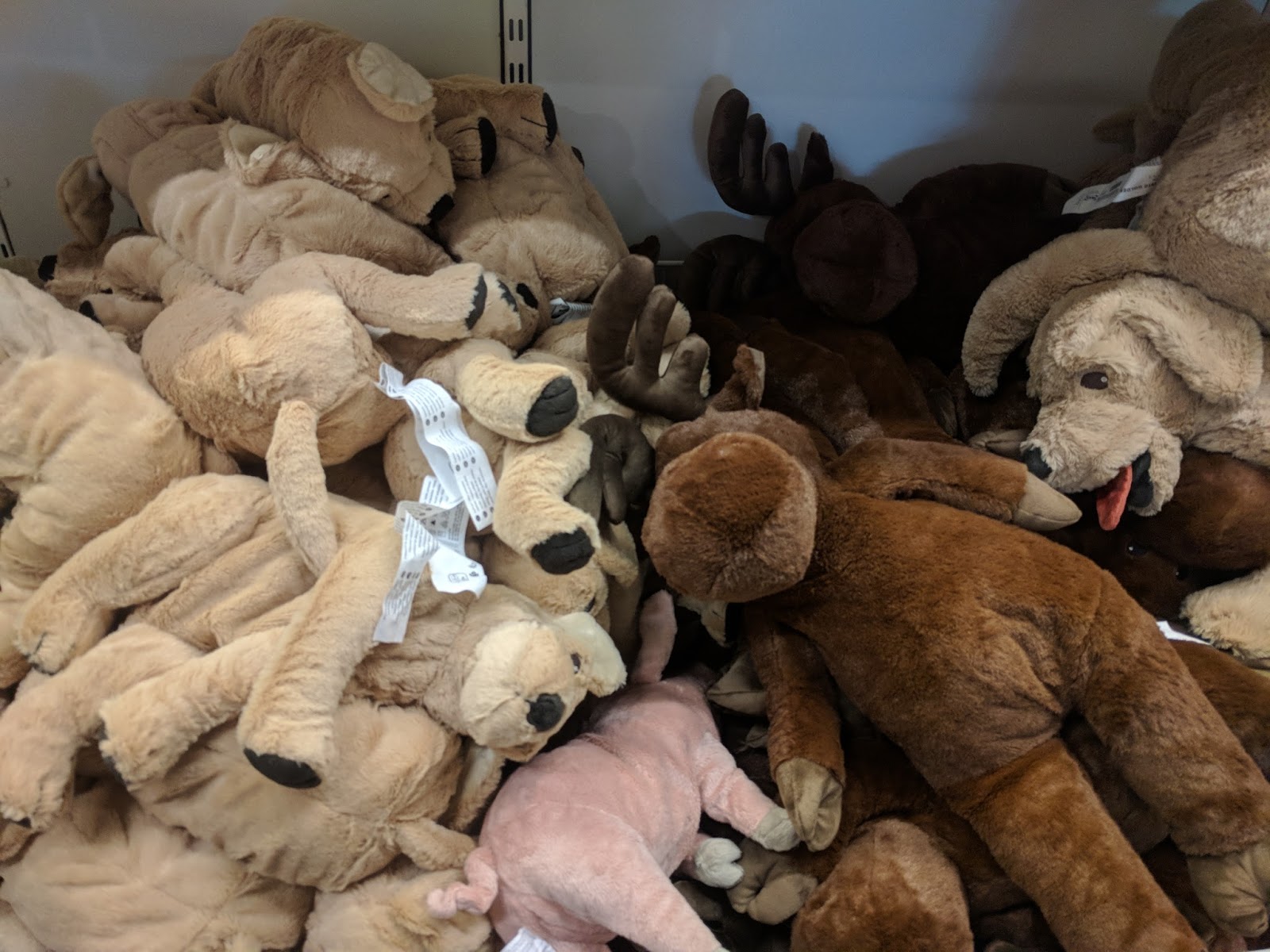 Die Kinder mögen die Plüschhunde, die sie einmal durch die Abteilung schleppen und am Ende wieder an dieser Stelle abgeben dürfen. Ich finde das toll wie vernünftig sie in dem Punkt sind. Es reicht ihnen einfach zu kuscheln.