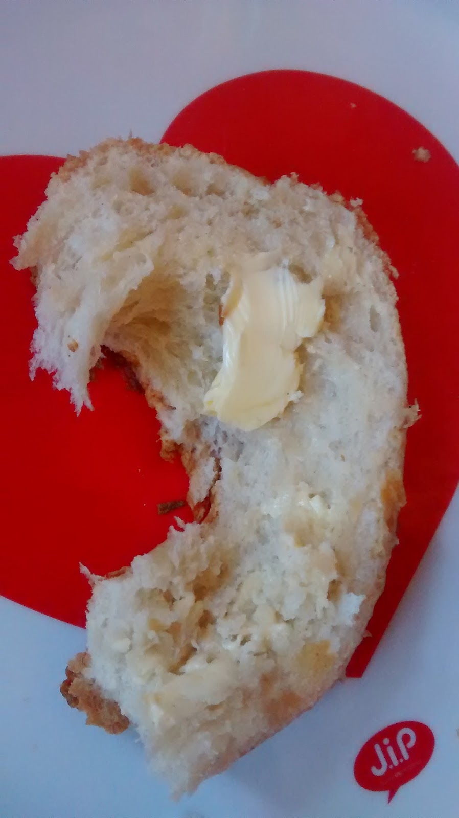 Da mein Mann gestern lange unterwegs war, erbarme ich mich und gehe mit dem Runzelfüßchen zum Bäcker. Anschließend besteht sie darauf ihr Brötchen selbst zu schmieren. Für mich ist das eher eine Zenübung, denn ja, es dauert bis zu diesem Ergebnis schon eine Weile. Aber nun gut, wir haben ja Zeit.