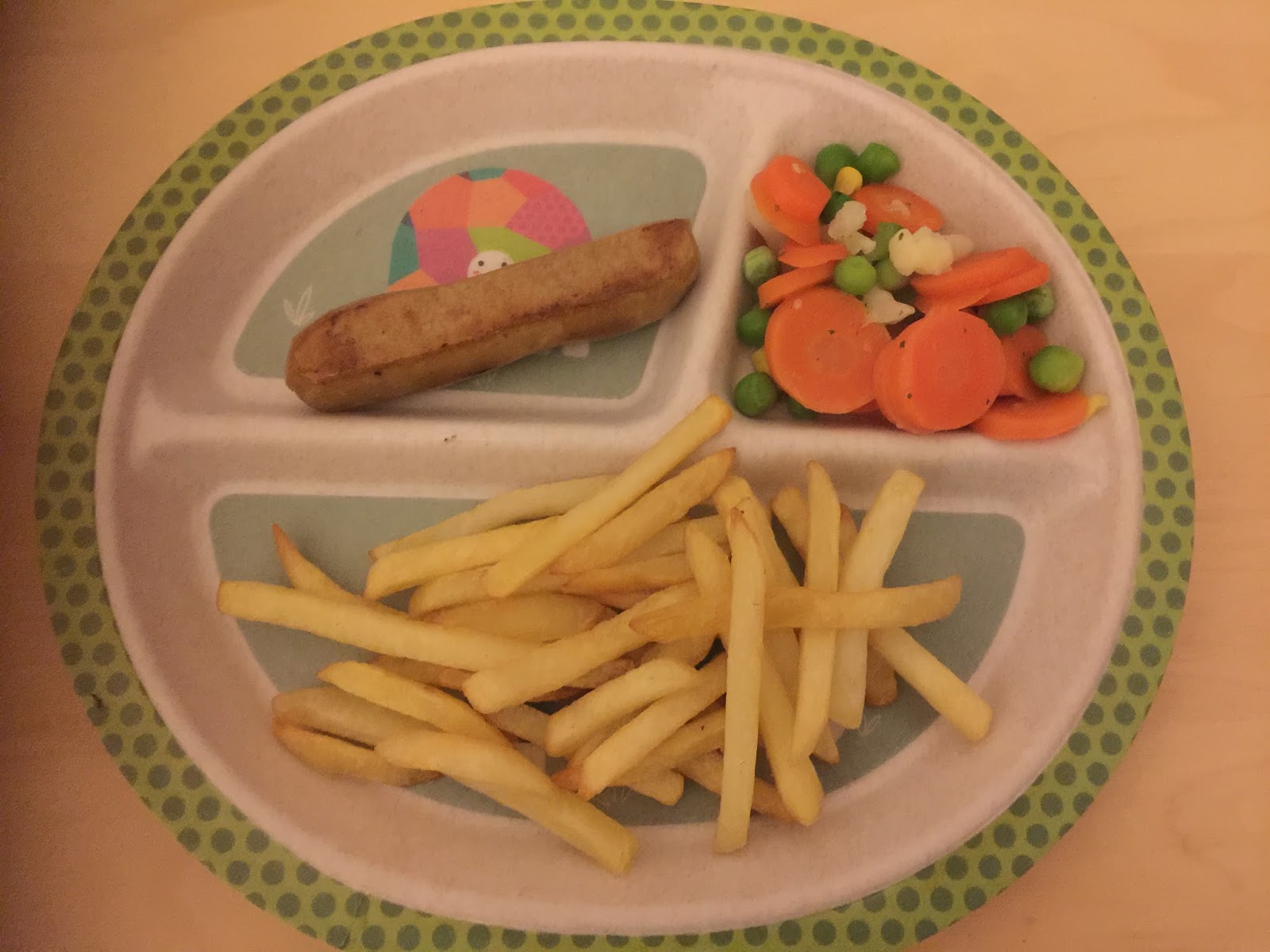 Zum Abendessen gibt es etwas Einfaches. Tofuwürstchen, Pommes und Gemüse. Nicht im Bild: Der obligatorische Kräuterquark, den es eigentlich immer dazu gibt.