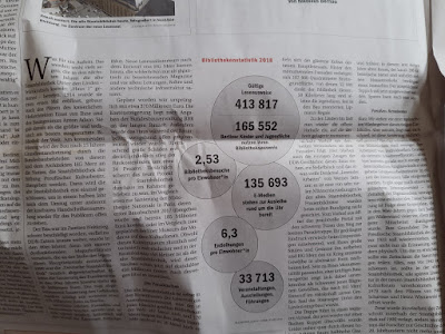 Ahh, Zeitung lesen. Am besten ja in Ruhe. Aber wenigstens irgendwie überhaupt. Ich habe absichtlich schon nur ein Wochenendabo, weil ich sonst überhaupt nicht dazu komme. Den Artikel hier finden die Kinder aber ganz interessant, es geht um die Bibilotheken. Deswegen darf ich ihn laut vorlesen. Also die Statistik. Ich finde ja, in einer 4 Millionenstadt in der jeder zehnte eine Bibliothekskarte hat und damit 2,53 Ausleihen pro Jahr tätigt irgendwie wenig. Allerdings haben wir auch alle fünf zusammen nur meinen Bibilotheksausweis, weil ich fürchte, dass die Kinder ihre nur verlieren würden. Also stimmt die Statistik vielleicht doch. Wir sind jedoch tatsächlich fast jede Woche in der Bibliothek und ich hoffe, dass das etwas ist, was ich meinen Kindern fürs Leben mitgeben kann. Die Liebe zu Büchern.