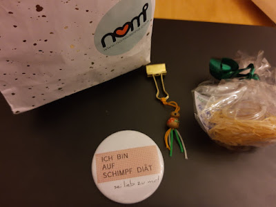 Beim Aufräumen habe ich noch eine Goodiebag gefunden, die ich nicht ausgepackt habe. Und die ich gern an euch verschenken möchte. Ich bekam sie zur Lesung von „Die Schimpfdiät“ von Daniela und Linda. In der Tasche befindet sich ein toller Button (mit Magnet, wieso gibt es sowas nicht öfter?), ein paar schöne Postkarten, Öl, ein Nomi-Floh (ich liebe die Armbänder von Nomi!) und etwas Süßes. Ein Poster von Kindherzgedanken gebe ich auch noch mit dazu.