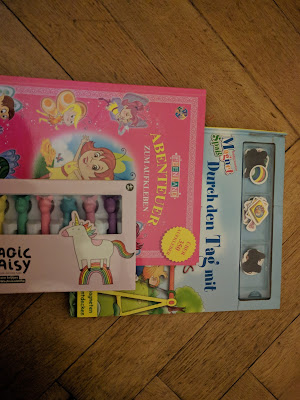 Das Runzelfüßchen ist zum Geburtstag eingeladen und ich muss in Windeseile noch das Geschenk einpacken. Sie hat sich für Wachsmalstifte in Einhornfrom und ein Sticker-Geschichten-Album entschieden. Aus der Bücherkiste, die wir gestern geschenkt bekommen haben (später mehr), sucht sie noch ein Leo-Lausemaus-Buch aus.