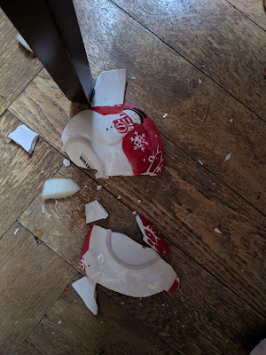 Ich bin wirklich richtig traurig über dieses Foto. Herr Annika hat mal wieder herumgeturnt und ich musste mich entscheiden wen ich rette: Schale oder Kind. Ist ja klar worauf die Wahl fiel, und es ist vielleicht auch doof, dass mein Herz so an dieser Weihnachtsschüsssel hing, die ich vor sehr vielen Jahren mal gekauft habe. Aber es ist so. Ich kehre also auf und denke ganz fest „manno, manno, manno“.