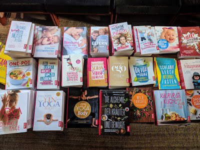 Zweitens, und das ärgert mich echt: Wir durften uns alle an der „Bücherbar“ bedienen. Also alle Bücher die ihr da seht hätte ich mir theoretisch mitnehmen können. Ich hab mir die ausgesucht die für mich und auch euch interessant sein könnten und habe die in eine Tasche gesteckt. Zuhause musste ich feststellen: Da fehlen Bücher. Keine Ahnung wer sich nun ausgerechnet an meiner Tasche bedient hat, vielleicht war es ein Versehen, aber es ärgert mich trotzdem. Ich hatte den Kindern nämlich vom Yoga („Ich hab das Buch, das können wir Zuhause nachmachen“) und der One Pot Pasta erzählt, die ich kochen wollte. Nun ja.