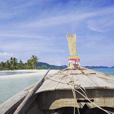 Wir entscheiden uns für einen Ausflug auf die Nachbarinsel Ko Yao Yai. Für knapp 12 € werden wir in einer waghalsigen Motorrad- Aufsatz-Konstruktion abgeholt, ich kralle die Kinder fest an mich, mein Mann fährt hinter dem vielleicht 15- jährigen Mädchen mit. Sie fährt aber wahnsinnig vorsichtig und nutzt die Zeit um mit Herrn Annika zu scherzen. Nach kurzer Fahrt sind wir bei ihrem Großvater, der uns in sein Logtailboot setzt, uns frisch geschnittenes Obst und Wasser in die Hand drückt und zu einem einsamen Strandabschnitt schippert. Der aber nur kurz einsam ist. Seht ihr wie traumhaft der aussieht? Unser Platz vorn unter der ersten Palme ist DAS Fotomotiv für all die Gruppen von Speedboad- Touristen, die hier für 30 Minuten anlegen, Fotos knipsen und dann wieder weiterfahren. Immerhin wollen ja noch mehr Inseln erkundet werden.