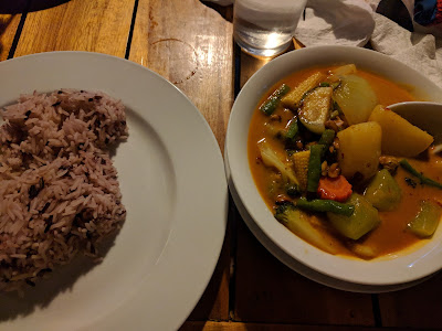 Wir spazieren ein bißchen durch die Gegend, auf der Suche nach Essen und werden fündig. Ich probiere mein achtes Massamancurry und freue mich, dass es jedes Mal anders schmeckt. Andere Gewürze, anderes Gemüse, andere Komponenten. Dass ein und das selbe Gericht so unterschiedlich interpretiert wird finde ich großartig, wiederkehrend dabei sind aber immer: Kartoffeln, Möhren und Erdnüsse. All das will Herr Annika immer, immer, immer, von mir haben.