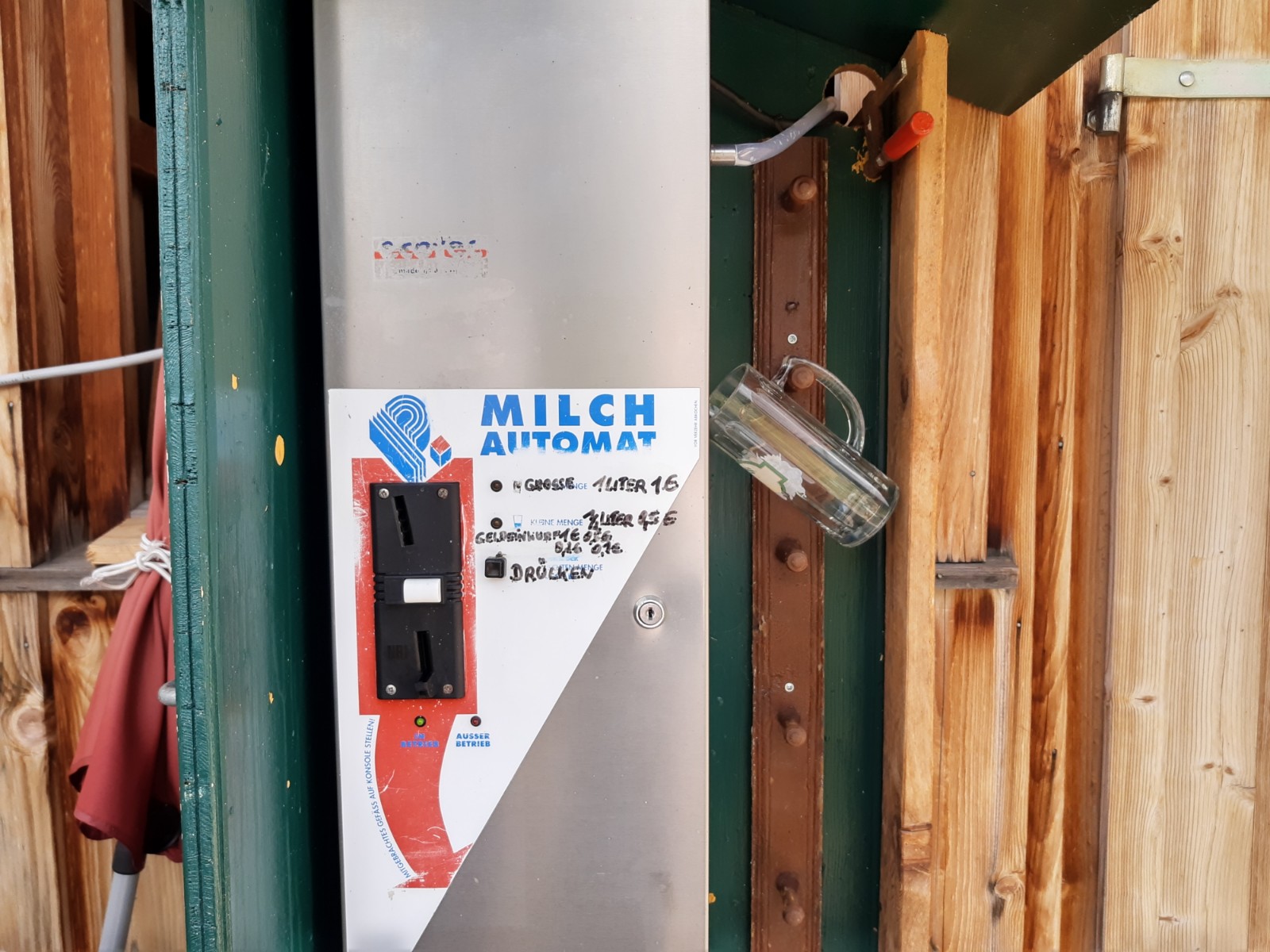 Herr Annika wünscht sich noch frische Milch asu dem Milchautomaten. Aber äh… wir haben wirklich gar kein Kleingeld. Ein Liter Milch kostet 1€, ich habe aber nur 2€ und 2 Liter brauchen wir nun wirklich nicht. Also bleibt meinem Dreijährigen dieser letzte Wunsch verwehrt. Hätte ich 10cent gehabt, ich hätte 100ml bekomme und die hätte mein Sohn sicher auch getrunken.