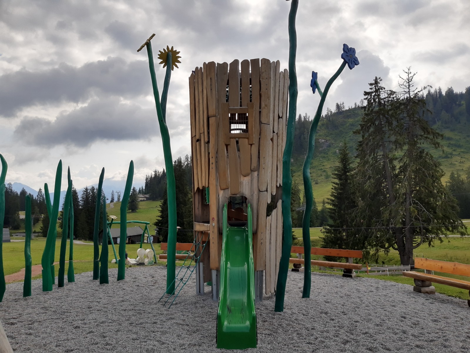 Wir sind zum Wandern verabredet. Das ist der letzte Punkt einer organisierten Pressereise ins Salzburger Saalachtal. Mittwoch sind wir hierher gestartet und haben im Prinzip nichts gesehen außer Autobahn. Am Donnerstag und Freitag haben wir dann mit anderen Familien die Gegend erkundet, heute steht zum Abschluss eine Wasserfallwanderung auf dem Programm, bevor alle Familien bis auf unsere wieder nach Hause fahren. Das hier ist der Abenteuerspielplatz auf der Lofer Alm. Die Kinder haben aber nur kurz dort gespielt, der Bergführer rief und wir wollten ja was erleben.