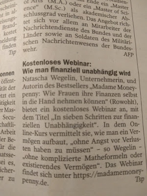 Das Runzelfüßchen ist beim Ballett, ich genieße meine Zeit allein. Lese ein wenig Zeitung (hier der Tipp für alle, es gibt ein Webinar von Madame Moneypenny zum Thema finanzielle Unabhängigkeit). Dann grüble ich nach, wohin wir so in den Urlaub fahren könnten und dann ist die Zeit auch schon wieder um. Kurz aber schön war es trotzdem.