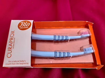 Das Baby hat ja reichlich Zähne und irgendwie denke ich immer: Ja, die müssen wir putzen. Aber das klappt natürlich nicht so richtig. Ich hab das jetzt trotzdem in Angriff genommen und diese Zahnbürsten hier, die haben alle unsere Kinder für die ersten Zähne gehabt. Ich finde die nämlich richtig gut. Und werde glatt ein bißchen wehmütig, weil ich nun zum dritten Mal die erste Zahnbürste für ein Kind auspacke. (Das Baby findet Zähne putzen übrigens super. Aber gut, es ist auch Tag 1.)
