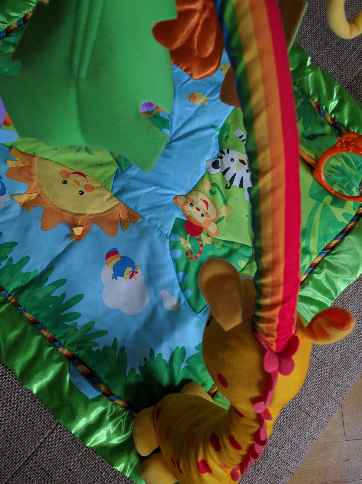Zum Anderen aber lässt diese Spieldecke mein Herz höher schlagen. Ich hatte sie damals fürs Runzelfüßchen gekauft, die sie ausgiebig bespielte. Und nun bekommt sie ihr Bruder. Ich kann mir nicht helfen, aber für mich ist das etwas Besonderes. Herr Annika nimmt die neue bunte Welt dankbar an. Während das Runzelfüßchen immer am Regler für Musik spielt (bei ihr hatten wir das nie an) fängt Herr Annika plötzlich an in der Bauchlage den Po zu heben. Demnächst will der kleine Mann wohl loskrabbeln. Ich verrate euch etwas: MIR ist das viel zu früh. Aber ich kann es ja auch nicht aufhalten.