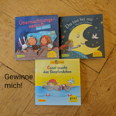 Und hier wieder eine Gewinnchance für euch. Das Runzelfüßchen hat diesmal vor allem „Gute Nacht“ Pixibücher ausgesucht. „Übernachtungsbesuch bei Mimi“, „Du bist bei mir – Gute Nacht Gebete“ und „Conni macht das Seepferdchen“ warten auf eure Kinder.