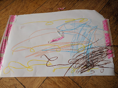 Dieser Rest Papier bleibt übrig. Ich klebe es auf dem Boden fest und die Kinder haben ihren Malspaß. Das bleibt jetzt da, bis es vollkommen zugemalt ist. Irgendwie ganz hübsch.