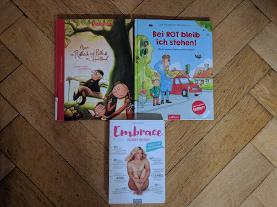 Vor dem Schlafen gehen müssen wir natürlich noch die neuen Bücher anschauen. Das Verkehrserziehungsbuch „Bei Rot bleib ich stehen“ war dem Runzelfüßchen besonders wichtig. Und dann gibt es da noch „Poesie für Kinder“, „Herr Ribbeck von Ribbeck im Havelland“. Ich mag das Gedicht so gern und die Zeichnungen im Buch sind großartig. Und ich beschäftige mich dann in den nächsten Wochen mit „Embrace“.