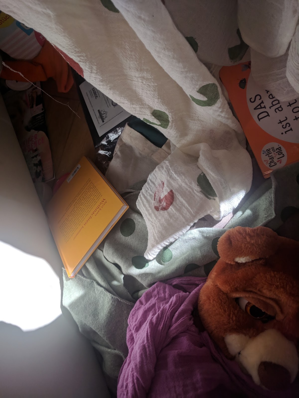 Anschließend will das Runzelfüßchen in den Kinderbereich, ich erkläre, dass ich nur noch ganz kurz an einer Stelle direkt daneben um die Ecke etwas suche. 2 Minuten später suche ich die Bibliothek ab, bis ich es neben der Eingangstür weinen höre. Meine Tochter hat sich auf den Weg gemacht und ganz viele Menschen haben sich um sie gekümmert. Sie war sehr verängstigt und auch ich hab einen ordentlichen Schrecken bekommen. Und war gleichzeitig froh, dass es eben doch Menschen gibt, die sich sofort kümmern.