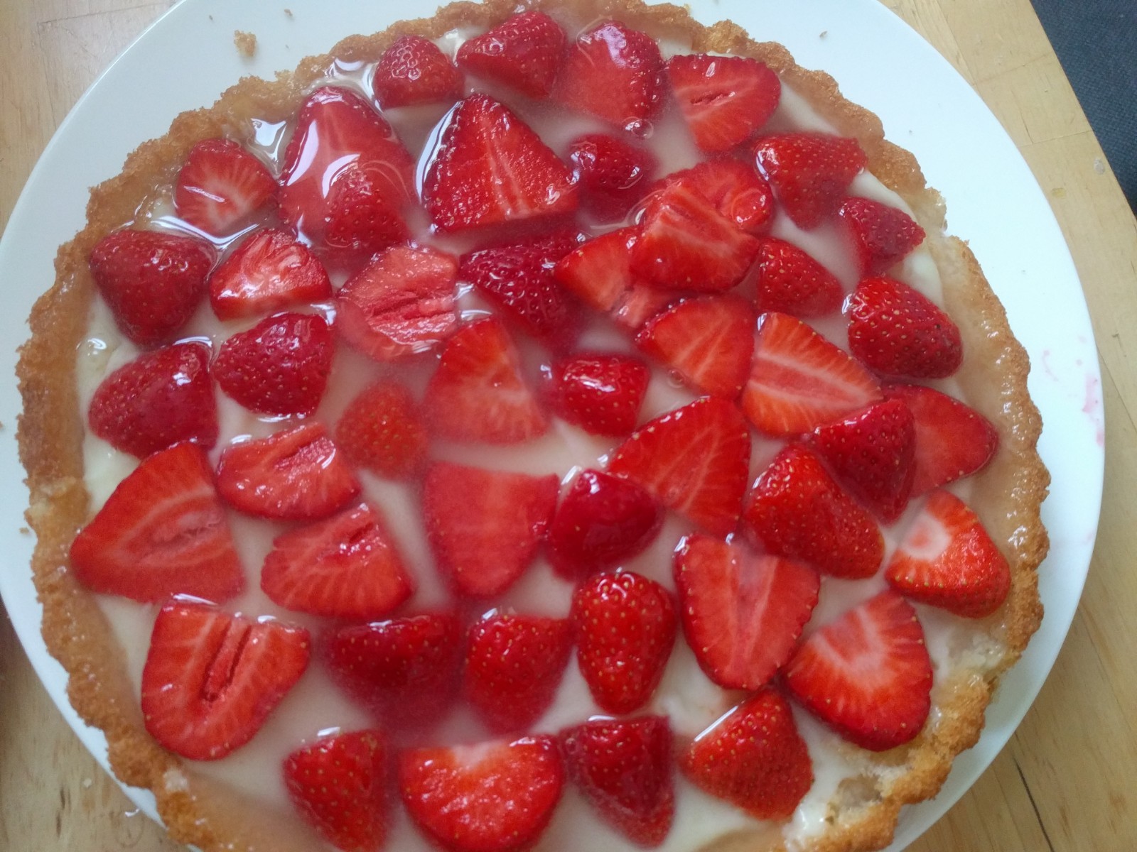 Ich verziehe mich mit den Kindern in die Küche (wie das klingt…) und „backe“ zwei Kuchen. Also ich belege fertige Böden mit Vanillepudding und Erdbeeren. Aber immerhin. Ist nämlich auch nicht leicht, wenn ständig jemand an einem zerrt und schreit.