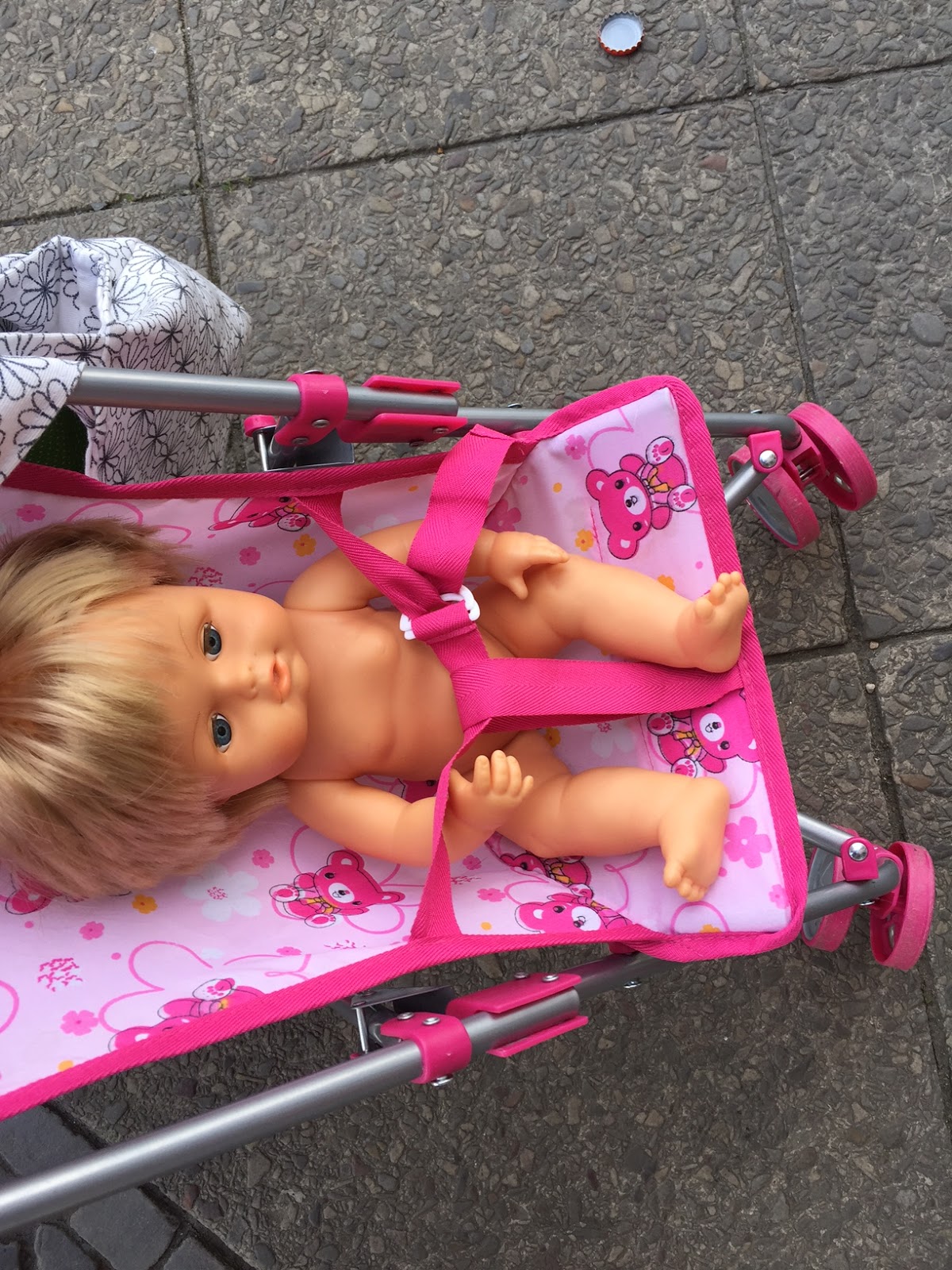 Während ich, die ich nachts nicht besonders gut schlafe, noch ein wenig vor mich hinschlummere, gehen Mann und Kind zum Bäcker. Mit dabei: Der Puppenwagen und die immernackte Puppe.