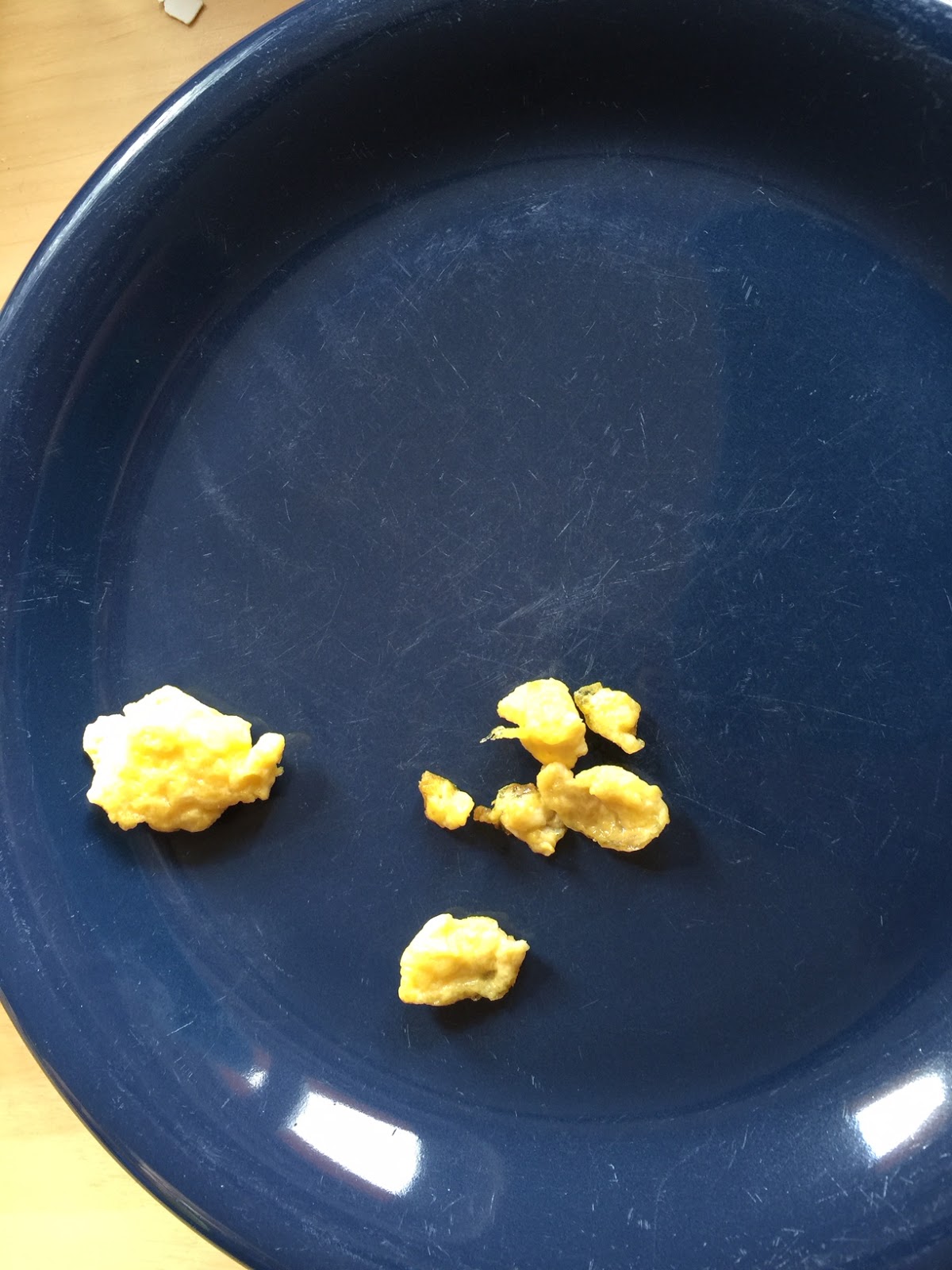 Es gibt Rührei zum Frühstück – also nicht für mich. Und irgendwie auch nicht für den Mann. Denn das Runzelfüßchen liebt Ei in jeder Form und will alles für sich behalten.
