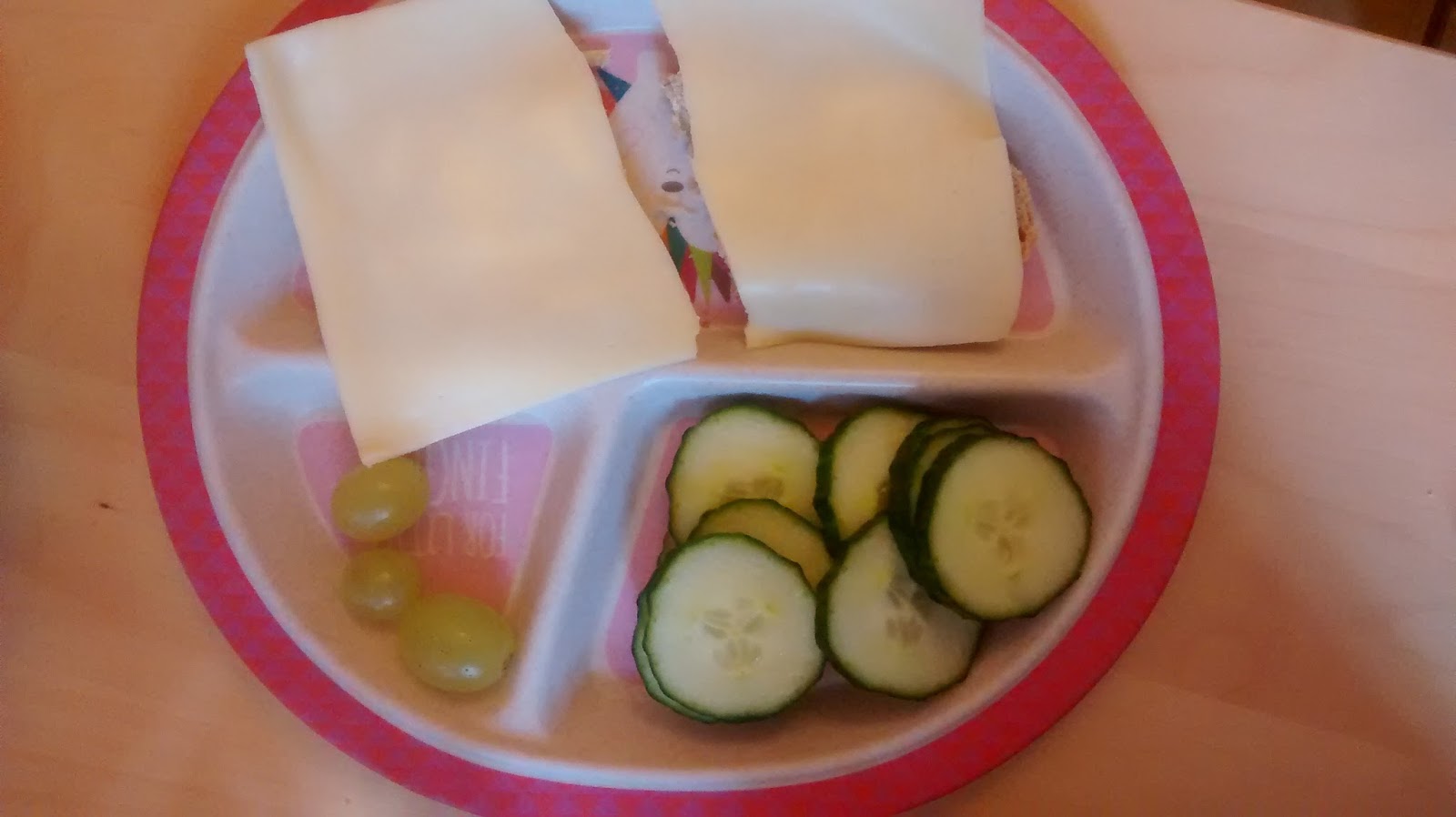 Mittagessen! Das Kind hat nicht wirklich Hunger und so verlangt sie nur nach Käsebrot und Gurke.