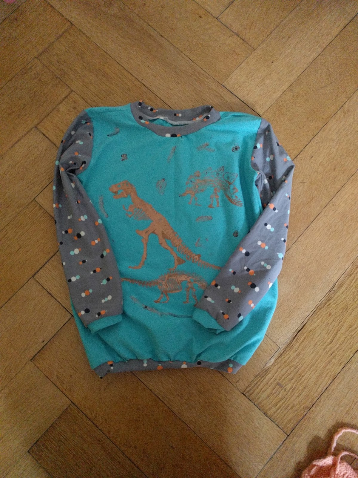 Das Runzelfüßchen ist untröstlich. Ihr einziger Pulli mit Glitzer, ein Geschenk, ist zu klein. Da kullern beinahe Tränchen. Deswegen verspreche ich, dass sie einen neuen Pulli bekommt, mit Glitzer ganz so wie sie es sich wünscht. Sie entscheidet sich also für einen blauen Stoff und dann Dinos in Bronze mit jeder Menge Glitzer drumherum. Zufrieden betrachtet sie ihr Werk. Ich finde ihn auch ganz gelungen.