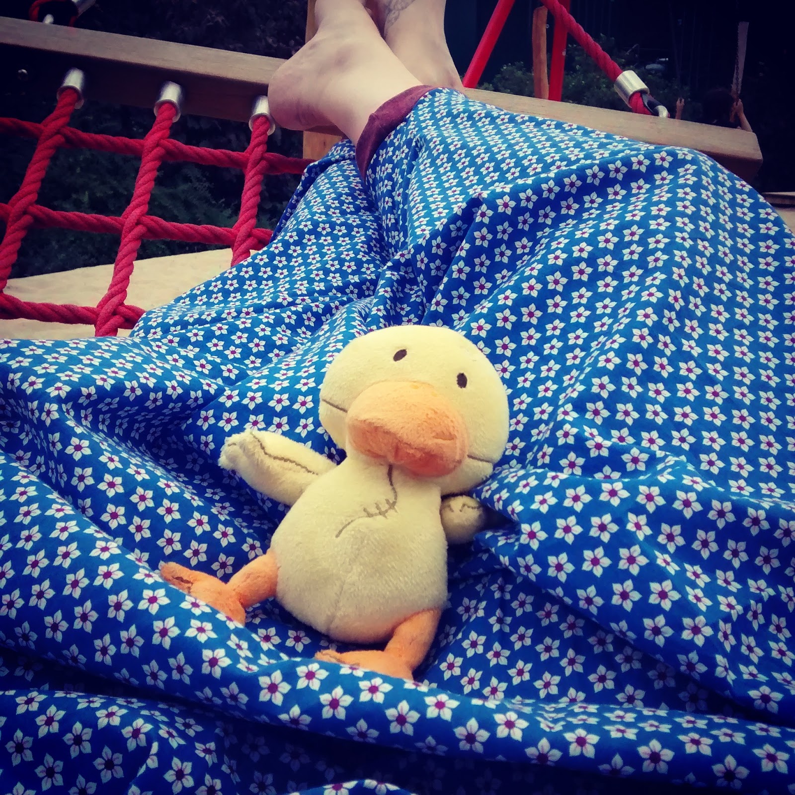 Während ich gemeinsam mit dem Runzelfüßchen in einer Art Hängematte schaukeln will fällt eine Biene (!) über mich her und sticht mir in die Hand. Dass das so weh tun kann. Mir rutscht auch ein „Oh Scheiße“ raus, weil ich auf Wespenstiche allergisch bin. Das Runzelfüßchen ist in heller Panik was nun passiert und wiederholt auf dem sofort angetretenen Heimweg immer wieder „Oh Scheiße, oh scheiße“. Ich erkläre ihr, dass man das nur sagen darf wenn eine Biene sticht und hoffe mal auf das Beste. Mit Kühlen und Salben versuche ich das Anschwellen der Hand in Grenzen zu halten.