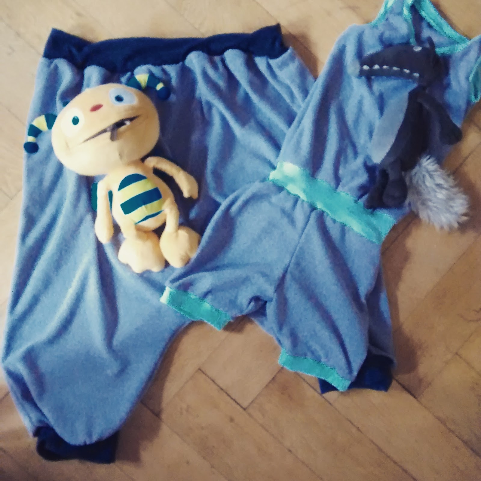 Das Runzelfüßchen hält Mittagsschlaf. Ich würde gern, aber Herr Annika hält mich davon ab, weil er gern ewig gestillt werden möchte. Daher entschließe ich mich weiter an den Hosen zu nähen. Heraus kommt eine Hose für den Mann und ein Jumpsuit fürs Runzelfüßchen. Darauf bin ich besonders stolz weil ich das vollkommen ohne Schnittmuster genäht habe sondern mir da einfach selbst überlegt hab, wie das klappen könnte. Hat alles hingehauen. Und das Beste: Das Kind möchte den Jumper nun eigentlich Tag und Nacht tragen.