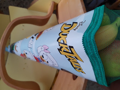 Eine Schultüte! Die Kinder sind ganz aufgeregt, weil ein Supermarkt in der Nähe für Schulkinder Schultüten verschenkt. Hier ist niemand ein Schulkind, was sie nicht davon abhält trotzdem nachzufragen, ob sie eine bekommen können. Und tatsächlich ist das kein Problem. Die Beute wird entsprechend stolz nach Hause getragen, unterwegs fällt eine Birne auf den Boden und das Obst muss dann doch recht schnell gegessen werden, aber egal. Eine Schultüte!