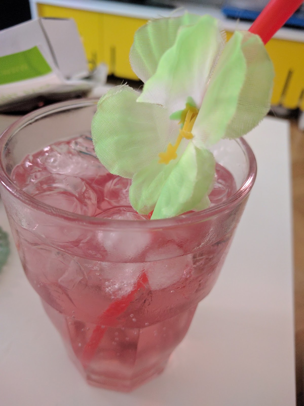 Liebe Freunde kommen vorbei. Wir wollen Fotos aus Thailand zeigen und zusammen kochen. Zu Beginn reichen wir ein Lieblingsgetränk aus Thailand: Italian Soda. Im Prinzip Sprudelwasser mit sehr vielen Eiswürfeln und einem Klecks Sirup. Und hübsch garniert, klaro. Da kennt das Runzelfüßchen nichts. Normalerweise gibt es bei uns keine Strohhalme, weil ich das als Umweltverschmutzung empfinde. Aber in dem Fall mache ich natürlich eine Ausnahme.