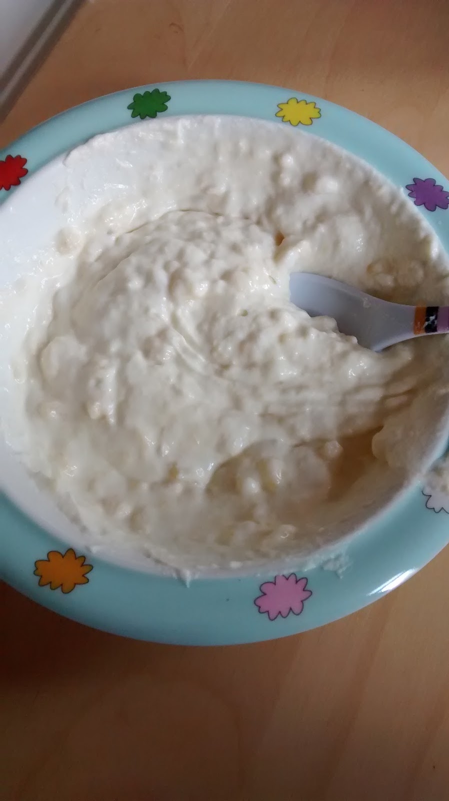 Das Mittagessen fiel aus, das Runzelfüßchen war irgendwie zu müde. Nach dem Aufstehen gab es selbstgemachten Bananenquark. Das Kind mochte es nicht. (Man muss ja auch zu seinen Misserfolgen stehen)