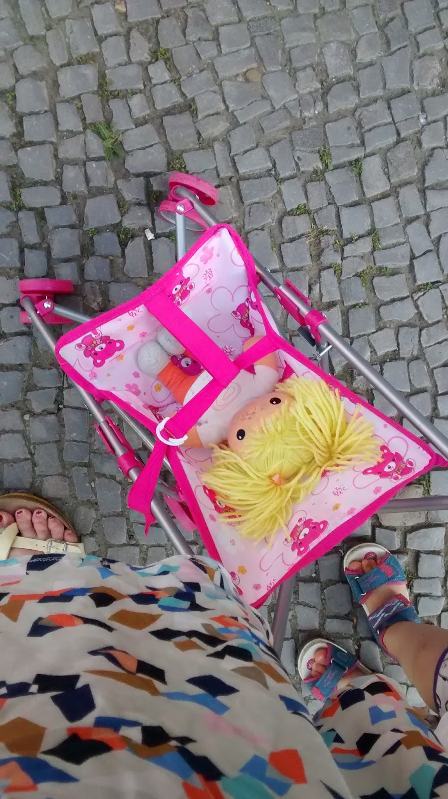 Das Runzelfüßchen und ich laufen zum Bäcker. Sie fährt ihren Puppenwagen spazieren und ich trage mein neues, selbstgenähtes Kleid.