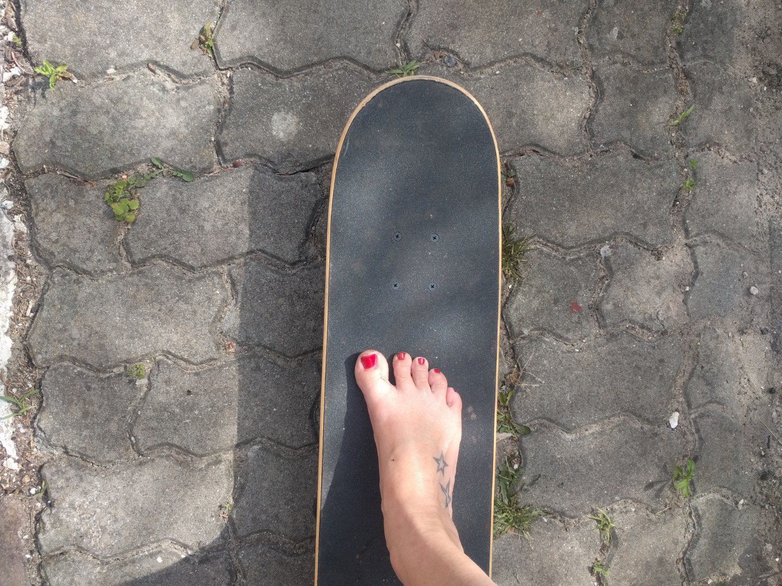 Ok, als die Kinder baden nutze ich den Moment und stelle mich auch aufs Brett. Und fahre ein paar Runden. Nach über zwanzig Jahren braucht man irgendwie mehr Mut als früher, um aufs Brett zu steigen. Weil die Fallhöhe höher ist? Der Körper älter? Unbeweglicher? Egal, ich drehe ein paar Runden (nicht auf diesen Steinen sondern auf glatter Straße, aber ohne Handy fürs Foto) und muss zugeben: Das macht immer noch voll viel Spaß.