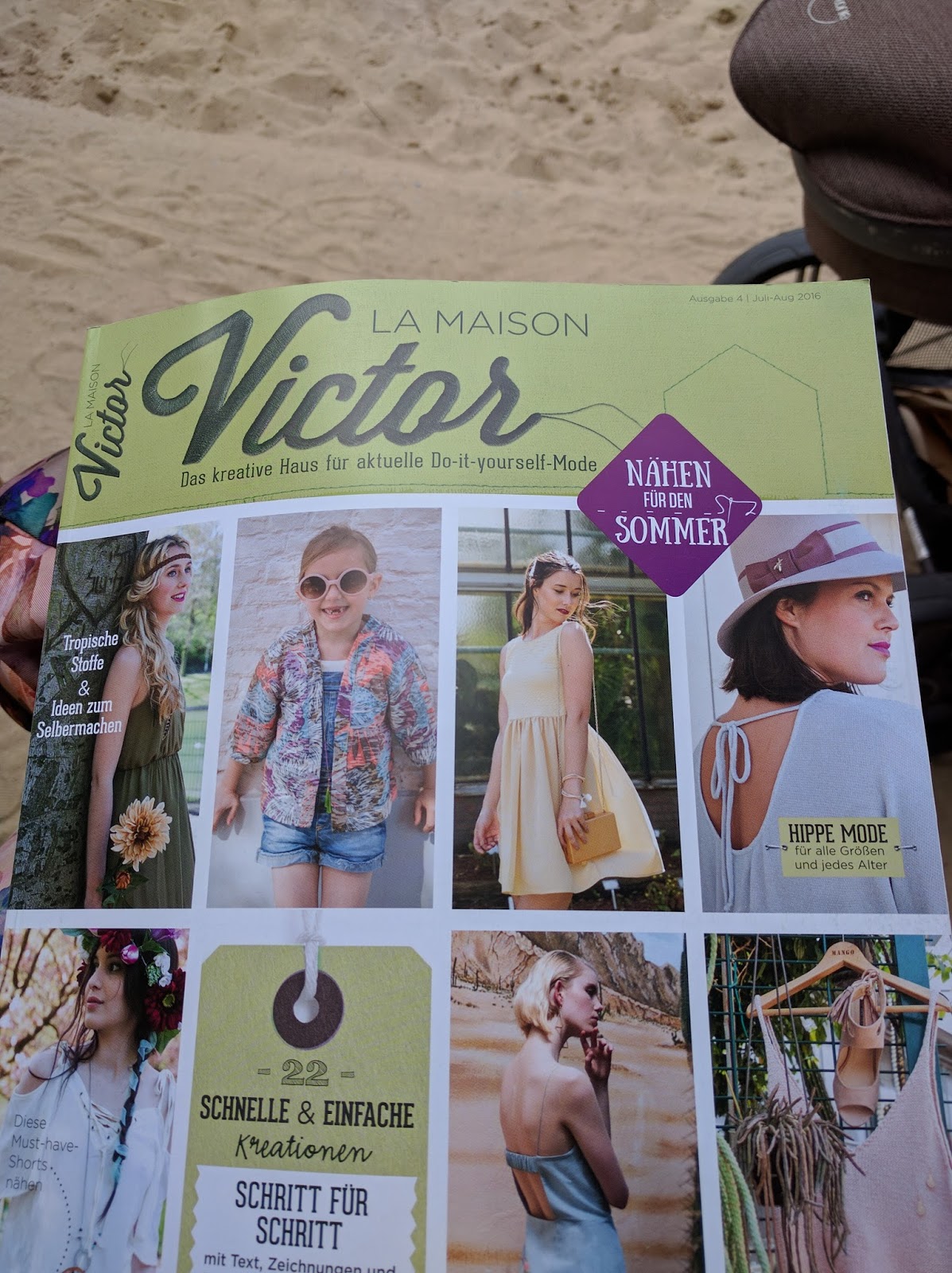 Während das Runzelfüßchen auf dem Spielplatz hüpft nutze ich die freie Zeit mit Herrn Annika im Schatten und blättere in einer Nähzeitschrift. Wir mussten den geliehenen Kinderwagen der Mieraus natürlich sofort ausprobieren, da ließ das Runzelfüßchen nicht mit sich verhandeln. Dafür schob sie allerdings auch die gesamte Strecke ihren Bruder und war stolz wie Bolle.