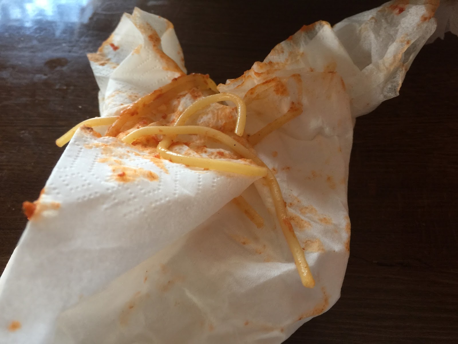 Zum Dank für die Babysitterdienste laden wir die Großeltern zum Essen ein. Das Runzelfüßchen will natürlich wieder Nudeln. Leider gibt es nur Spaghetti, die das Kind großzügigst auf sich und ihrer gesamten Kleidung verteilt. Vor lauter Tomatensoße ist nicht mehr viel zu erkennen, aber irgendwie ist das so lustig, dass wir sie einfach machen lassen. Und es gibt ja Waschmaschinen.
