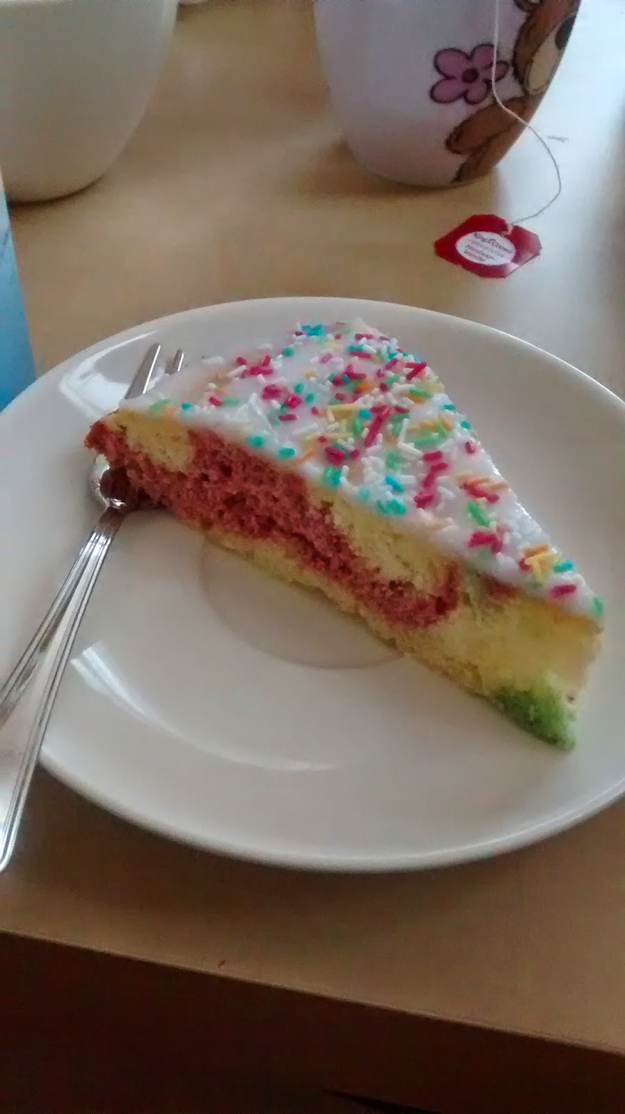 Zum Schluss gab es noch einen tolle Grund zum Feiern: Ich bin Tante geworden. Also schon vor etwas längerer Zeit, aber nun durfte ich das erste Mal den neuen Erdenbürger besuchen gehen. Das Runzelfüßchen wirkte im Vergleich zu diesem neuen Menschlein so unglaublich groß, dabei trennt beide doch nur ein Jahr. Ich bin sehr gespannt auf diese Neuerung, Tante sein und all die Aufgaben, die vielleicht auf mich zukommen. Kuchen backen kann ich auf jeden Fall schon mal. Dieses bunte Exemplar ist nämlich mit Liebe selbst gebacken.