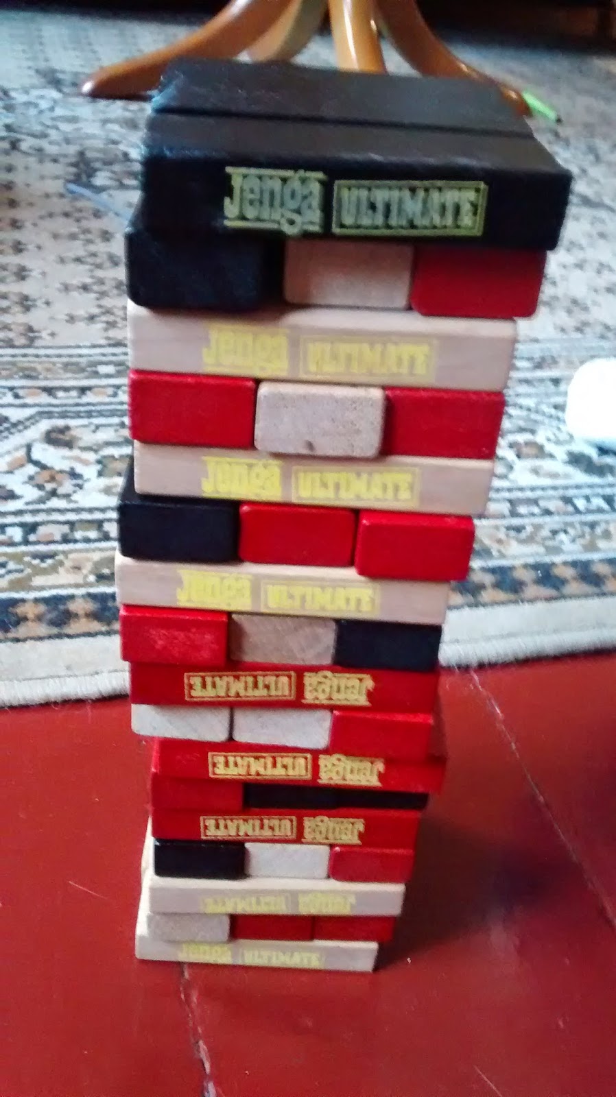 Am Sonntag war Besuchstag. Zu erst waren wir bei Runzelfüßchens Großeltern. Während die meine Tochter bespaßt haben, habe ich mit der Tante vom Baby eine Runde Jenga gespielt. Oma und Opa haben es eigentlich rausgekramt, damit das Runzelfüßchen ein paar Bauklötze zum Spielen hat. Aber nö, statt dessen haben wir uns ein verbissenes Duell geliefert. Ich habe übrigens verloren.
